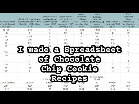 Please note that listing ingredients is not covered by copywrite law and by just listing the various ingredients, quantities, temperatures and times like this it is not considered unique enough to be under copywrite law. I did list the sources, although roughly, above each recipe for reference. I think it is common curtesy to let you know were each recipe came from, not to mention it shows that these are real variations on chocolate chip cookies out there! Here is an article that I have used for reference before I posted this spreadsheet.